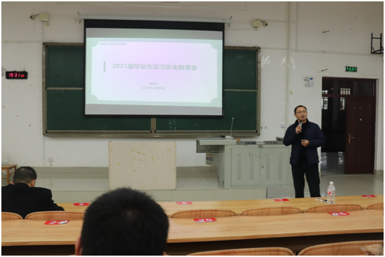 2020年12月29日晚上七点,球王会体育官网在弘毅楼一区105召开毕业生实习安全教育会,由党委副书记谭黔林主持,2017级全体学生参加会议。