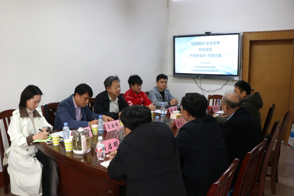 双方就学院在网络安全领域的教学和研究现状、未来的发展规划、数字密码技术在网络安全领域的应用和发展趋势、产学研合作、学科建设、实训环境建设、人才基地建设以及以赛促学、以学助教等方面进行了深入交流。