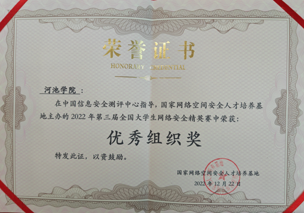 球王会体育官网在中国信息安全测评中心指导,国家网络空间安全人才培养基地主办的2022年第三届全国大学生网络安全精英赛中获得优秀组织奖,朱强炜副院长代表大赛组委会向球王会体育官网颁发了荣誉证书。(作者:覃芊积拍摄:覃芊积校对:魏志荣 审核:黎军)