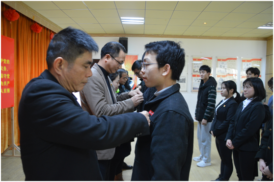 仪式开始,组织委员容万韬同志宣布今年发展新党员名单,并由老党员给新党员佩戴党员徽章。紧接着,容万韬同志领读入党誓词,全体党员面向党旗,举起右手进行宣誓。