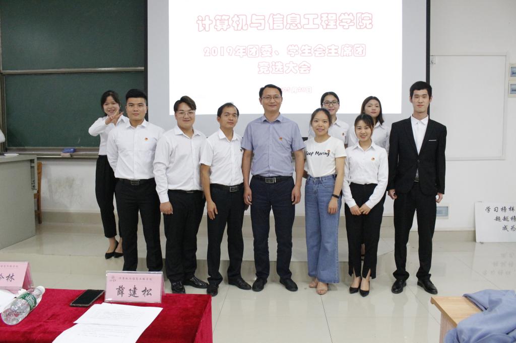 5月30日下午3点,计信学院在弘毅楼2-506室召开了团委、学生会主席团竞选大会。计信学院党委副书记谭黔林、团委书记容万韬、团委副书记耿德华、以及辅导员杨艳、薛建松老师出席大会并任评委,计信学院团委、学生会全体成员、各班级代表、社团代表以及二级学院学生代表也出席了本次大会。