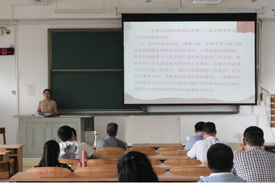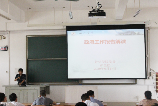 6月17日下午,计信学院在弘毅楼2-507教室召开政治理论学习会议聚焦“两会精神”。全体教职工参加会议,会议由学院党委书记彭金松主持。