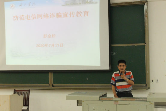 为提高同学们电信诈骗防范意识,计信学院积极响应自治区和学校的号召,2020年7月17日,计信学院于弘毅楼1-105教室召开了防范电信网络诈骗宣传教育会议,本次宣传教育会议由计信学院党委书记彭金松主持,计信学院师生代表参加会议。