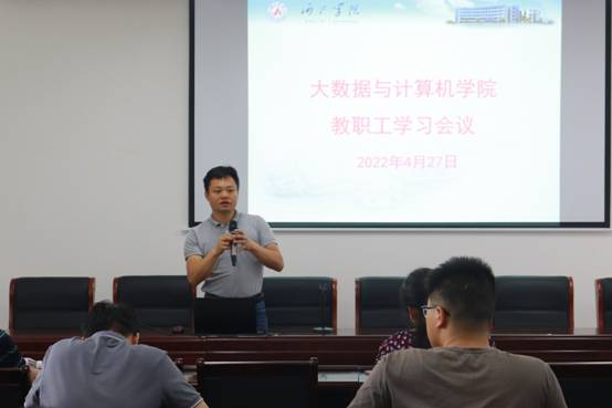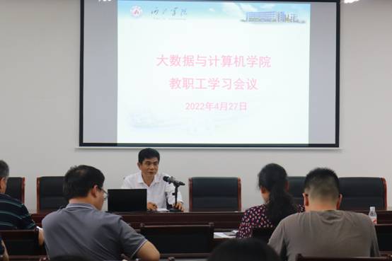 2022年4月27日下午,球王会体育官方网在逸夫楼407会议室召开教职工学习会议。会议由院长何奇文主持,全体教职工参加。