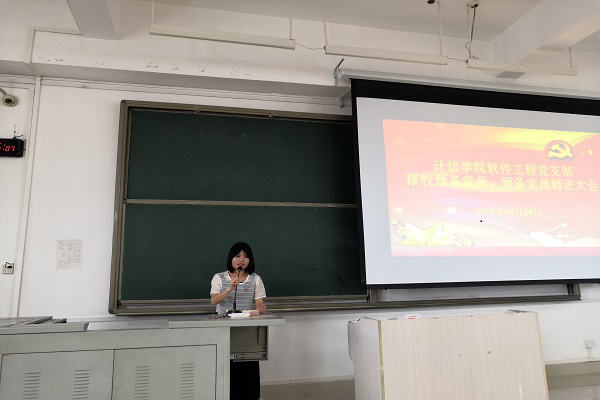 6月4日下午17点,计信学院软件工程党支部于东区弘毅楼2-506召开接受周春泉、黄俊斯、龙鑫、吕日剑4位同志为预备党员以及关于石志军、庞辉龙、凌怡、程艺明、韦梦兰5位预备党员同志转正的会议。本次会议由支部书记肖辉辉主持。计信学院软件工程党支部全体成员参加会议。