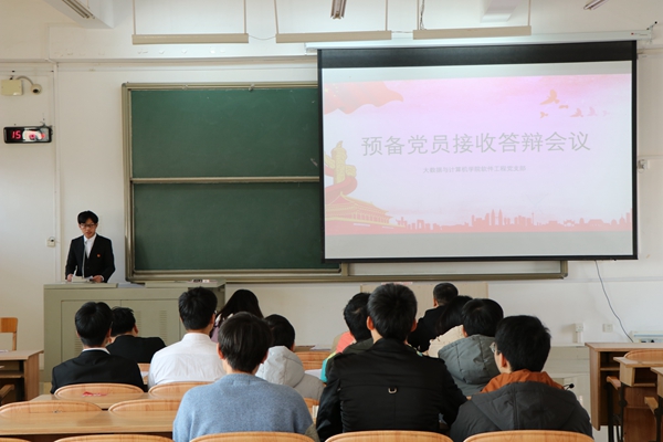 由郑龙强同志宣布答辩会议开始。发展对象蒙显继、文善辉、陈宇、龙自程、欧豪承、黄海凤、莫宝琪、程君、卢兴泽、齐邦源、范修玉、刘俊君等12位同志依次上台分别从学习、工作、生活以及思想上进行个人陈述,其中范修玉、刘俊君两人因在外实习采用视频会议进行个人陈述。接着由答辩小组对12位同志进行相应提问。最后答辩小组成员对12位同志进行公平投票。