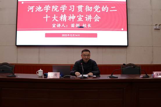 苗剑首先从党的二十大报告撰写的过程阐述了学习宣传贯彻二十大精神的极端重要性。他说,党的二十大报告是坚持走群众路线,反映人民意愿,汇集全党和各方智慧,充分解放思想,广泛凝聚共识的报告;是新时代马克思主义中国化时代化的纲领性文献;是以中国式现代化全面推进中华民族伟大复兴的行动指南。因此,学习党的二十大报告,深刻领会党的二十大精神,不仅是当前及今后一段时间我们政治生活中的一件大事,也是运用马克思主义的世界观和方法论引领学校事业高质量发展的时代命题。
