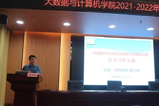 晚上,球王会体育官网新区办建设办公室副主任黄介观在格致楼101给培训班学员讲授公文写作,他从从公文及公文处理的概念、学习公文的目的、公文的重要性、如何撰写公文、如何提高公文写作能力等方面教导参训学员如何正确撰写公文。他以幽默的语言,就如何写好公文,进行详细讲解和指导,为参训学员的公文写作提供了理论指导。
