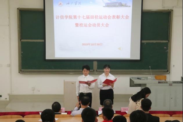 在表彰大会上,主持人宣读此次计信学院田径运动会的比赛佳绩,随后领导老师上台为获奖班级以及获奖运动员颁奖并合影留念。在校运会动员大会中,教练员代表钟春梁同学上台发言,表示将用科学的方法对运动员进行训练,进行刻苦而系统的训练,为运动员们参加各项赛事取得好成绩打下坚实基础,指导计信学院运动健将在校运会上取得理想的成绩。运动员代表冯格花同学发言说到,我们作为一名大学生,不仅要注重学习,更要注重德智体美劳的全面发展,我们要超越自我,竭尽所能,争取在校运会上为学院再接再厉、再创辉煌。