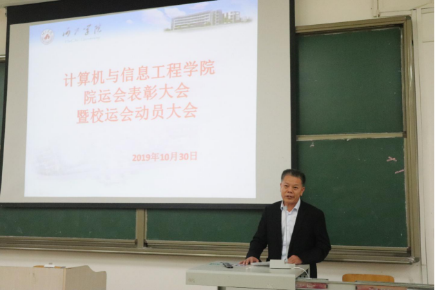 10月30日下午,计信学院在弘毅楼1-102教室举办第十七届院运会表彰大会暨校运会动员大会,计信学院院长林芳、党委副书记谭黔林、团委书记容万韬、辅导员杨艳、韦琳素等老师以及各班代表出席本次大会。
