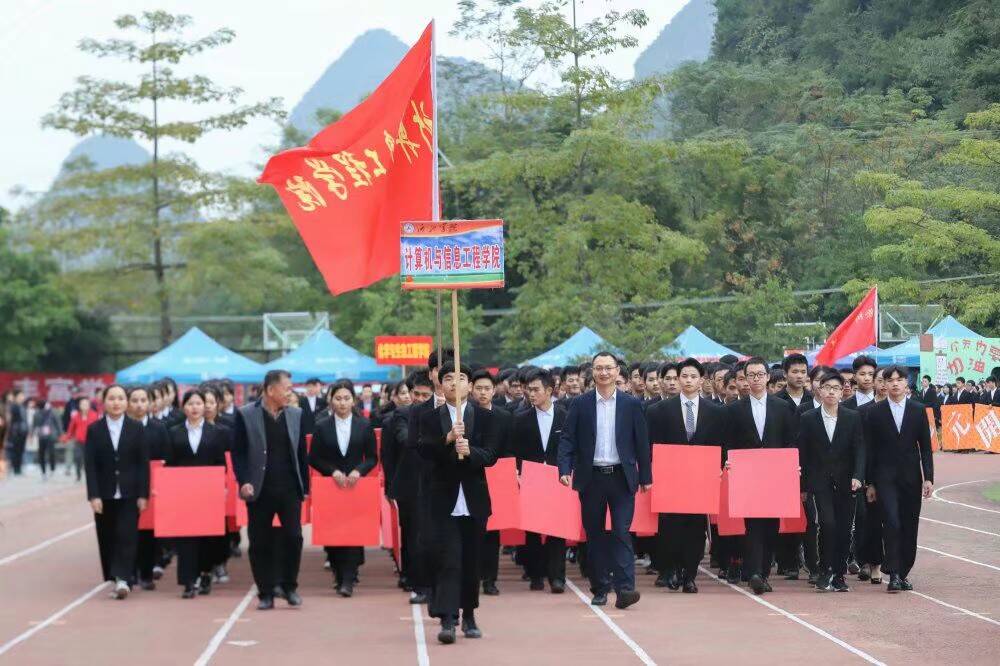 随着学校领导和学生代表对本次运动会的致辞,计信学院带着辛勤训练方正队形的120名同学身着统一的服装,迈着整齐的步伐,以昂扬的气势走到主席前,喊着“赛场点兵,计信最拼;校运风采,计信主宰”的口号,在主席台拼成的“计信加油”的字样,他们个个朝气蓬勃,展现了计信的精神风貌。
