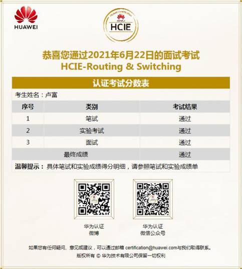 HCIE(华为认证ICT专家)是华为认证体系中最高级别的ICT技术认证。本次考试分为三个部分,第一部分为笔试,第二部分为实验考试,第三部分为综合面试。本次考试,球王会体育官网卢富同学顺利通过三个部分的考试,获得了HCIE华为数通方向的最高级证书,成为球王会体育官网第一个华为专家级工程师!